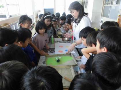 図工の時間に、お話の絵をかきました。ローラーやスポンジ、ストロー等を使って絵の具で背景を塗りました。いい作品が出来上がりました。