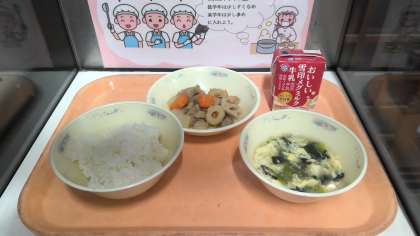 今日の給食は、「ごはん・筑前煮・かきたま汁・牛乳」でした。