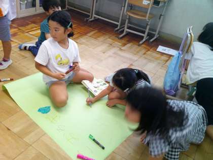 今日は、お世話している虫のチームごとにワークシートをまとめたり、気づいたことを模造紙に書いていきました。おすとめすの見分け方や好きなえさ、どんなところがすきかなどを自分たちで分担しながらまとめていました。