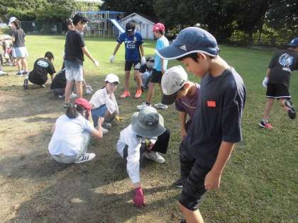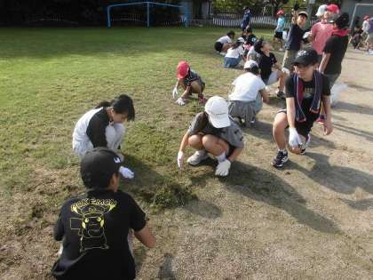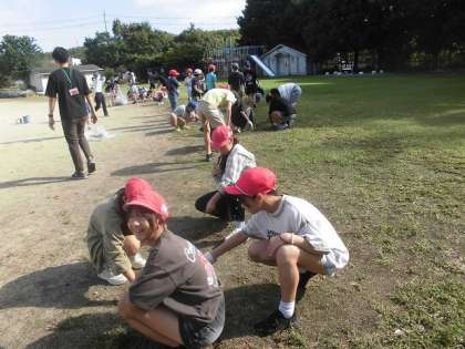 運動会を気持ちよく迎えるために、先日、全校児童で校庭の草引きを行いました。