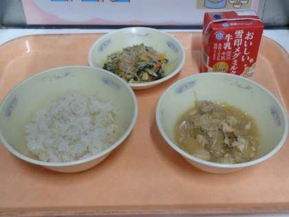 今日の給食は、「玄米ご飯、牛乳、かしわのすき焼き、もやしの煮びたし」でした。すき焼きは江戸時代に関西地方で農具の「すき」を鉄板代わりに使って、食材を焼いていたことが始まりと言われます。給食では、とり肉(かしわ)、焼き豆腐、玉ねぎ、えのきだけ、糸こんにゃく、切りふが入っていました。味がよく染み込んでいて、とても美味しかったです。
