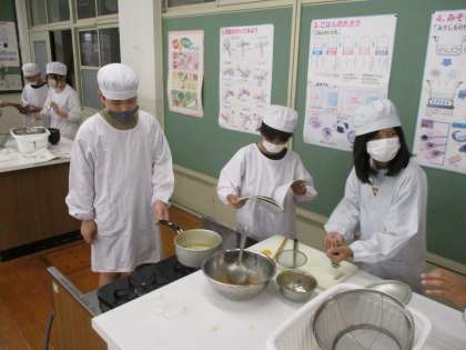 今日の5年生の家庭科では、みんなで「みそ汁づくり」を行いました。煮干しからだしをとって作ります。だしの味も確かめながら、グループで協力して作りました。とても美味しくできあがり満足そうでした。
