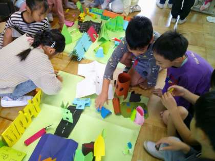 紙を折って立てた形から思いついたものを作り、みんなの作品を合わせてまちを作りました。