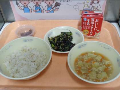 今日の給食は、「麦ごはん・高野どうふのそぼろ煮・小松菜とひじきのいため物・しば漬・牛乳」でした。しば漬の酸味が苦手という子もいましたが、「食べてみたら美味しかった。」との声が聞こえてきました。高野豆腐は優しい味のあんが絡んで食べやすく、とても美味しかったです。ごちそうさまでした。
