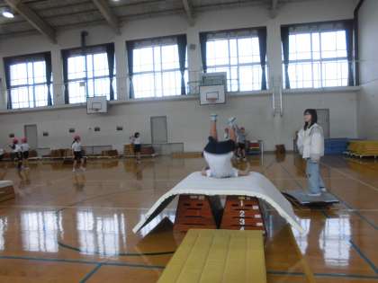 「ゴムの場」やマットを使った「広い場」を作って、横かかえこみ跳びや台上前転の練習に励む子がたくさんいました。