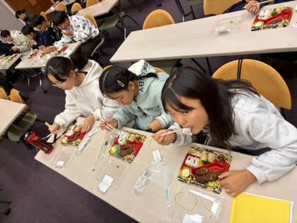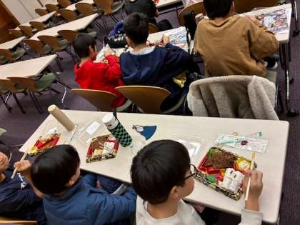お昼ご飯の時間です。お腹がすいた子どもたち。お弁当の味噌カツに舌鼓をうっています!