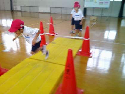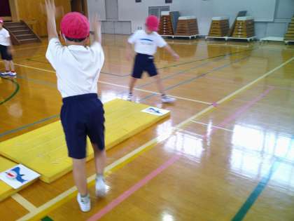 「さかの場で、まるたごろがりをすると、はやくまわって楽しかった。」「ながいすの場でまえころがりをすると、まっすぐ回れたよ。」「ゴムの場は、どうしていくかを考えて、うさぎ跳びでいきました。」など、場に応じてマットあそびをしていました。