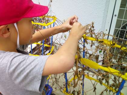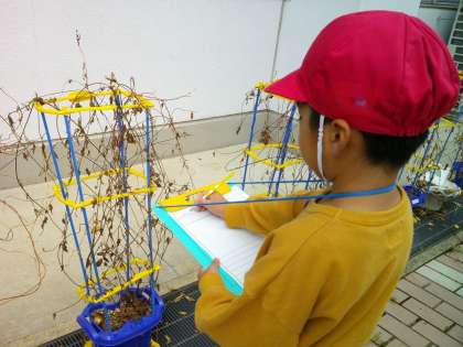 夏とちがうところはどんなところかを探す中で、あさがおの様子も観察しました。「夏は花が咲いていたけど、もう咲いていない。」「葉もつるもかれて茶色です。」「夏は種が緑で取りにくかったけど、今はパリパリで種がとりやすいです。」など、夏のあさがおの様子と違うところを見つけていました。