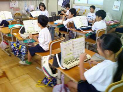 色を音に表す活動では、色の様子を表せそうな楽器の人が音を調整しながら鳴らしていました。また、カスタネットとトライアングルを組み合わせたら、この様子が表せそうと考えて演奏していました。