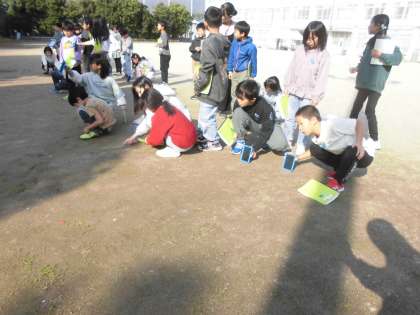 鏡で日光をはね返すと、地面に光の道筋がきれいに見えて、「お〜!!まっすぐに進んでいる!」と感動していました。