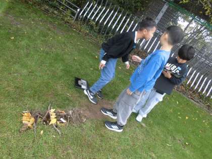 友だちと協力して、いのちの森や芝生で、枝や落ち葉を上手に使って「すみか」を作っていました。