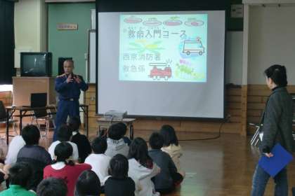 西京消防署の救急係4名の方に来ていただいて,教えていただきました。