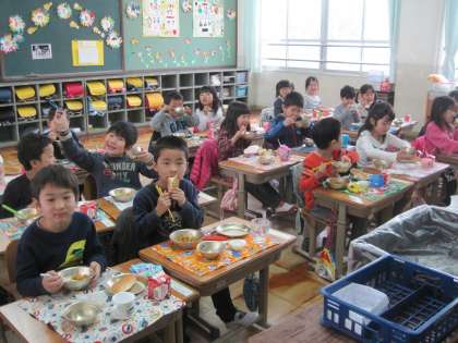 教室をのぞくと,みんなおいしそうに給食を食べていました。