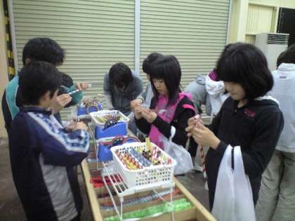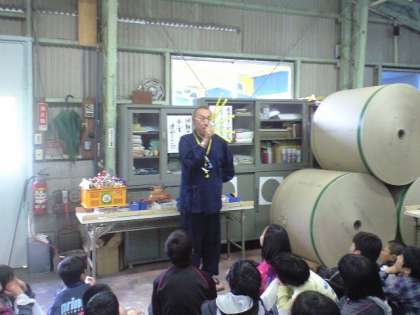 ふきもどしの里に到着です。おじさんの話をしっかり聞いています。そして,吹き戻し作りに挑戦!