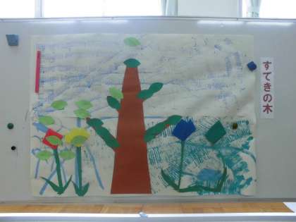 今日の5時間目,授業参観でお母さんたちの見守ってくださる中,図工『大きな絵をかこう』の学習をしました。まずはコロコロスタンプを作りました。二人とも思い思いのコロコロスタンプが完成し,さっそく絵具をつけて模造紙にコロコロ。スタンピングできた模造紙の真ん中に木を貼ると「あっ!空だ!」「森だ!」の声にみんなで作った折り紙のチューリップも貼って…さらに,始業式から集めた素敵な『できた』を書いた葉っぱも貼って「3くみ すてきの木」が完成しました。