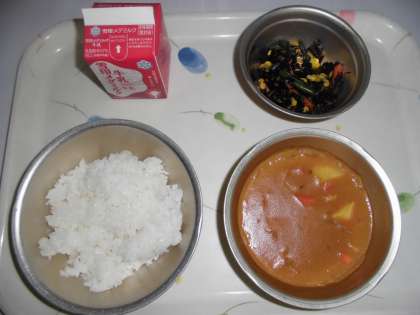 1年生に辛くないようにと,少しカレー粉を控えめにして,やさしい味に仕上げました。今日は,給食室でからも入学のお祝いにと,チキンカレーに桜型のにんじんを