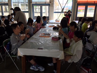 淡路島牧場でバター作りに挑戦しました。容器の中に乳脂肪分の多い牛乳と冷たい水を入れ,激しくシェイクすると,何やら手ごたえのあるゴロンとしたものが出てきます。これをラップ等の上にあけ,へらでつぶし,水分を取り去り,食塩で味を調えるとバターが出来上がります。初めは全然できなくて,振るのがただしんどいだけでしたが,ある時フッとでき,そちらこちらで歓声が上がりました。できたバターはクラッカーにつけて食べました。さてお味は……?