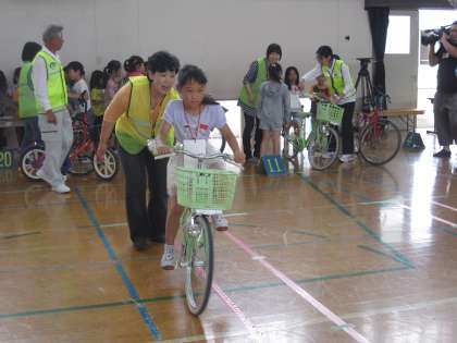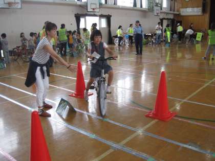 続いて,まず2年生が実際に自転車に乗って練習しました。