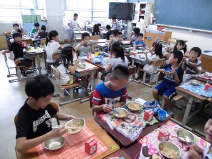 釜でお米を炊く時は,火加減,蒸らし加減に特に気を配ります。今日も,少しおこげもでき,おいしくたきあがりました。子どもたちは「おいしい〜」と,あっという間にすっからかんでした。