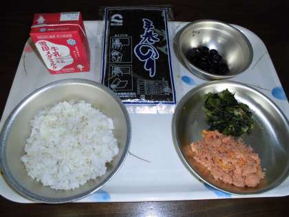 今日の給食の献立は,麦ごはん,牛乳,セルフおにぎり(手巻きのり付),ほうれん草のおかか煮,そしておせち料理の「黒豆」です。