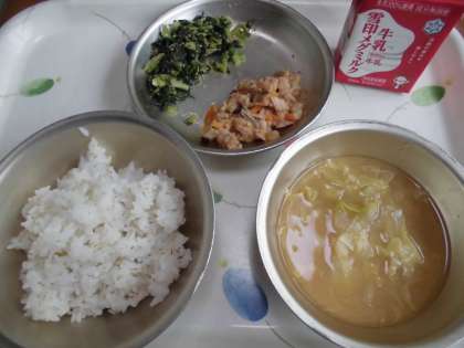 今日は,ごはん・牛乳・そぼろどんぶりの具・だいこん葉のごまいため・春野菜のみそ汁という献立でした。1年生もごはんにそぼろどんぶりの具をのせて,上手に食べていました。