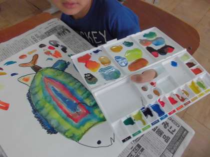 絵具チューブから出した色ではなく,色と色をパレットで混ぜる方法を学び,魚に色を塗りました。