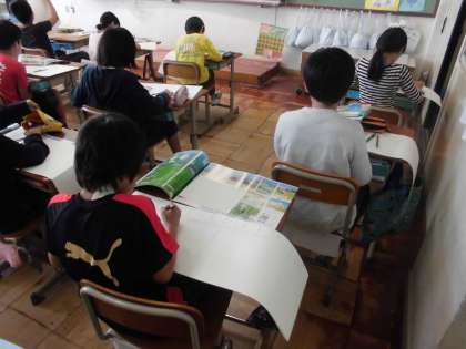 また1・2年生が校内探検をしており,5年生の学習の様子を静かに見ていました。