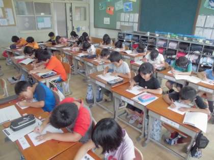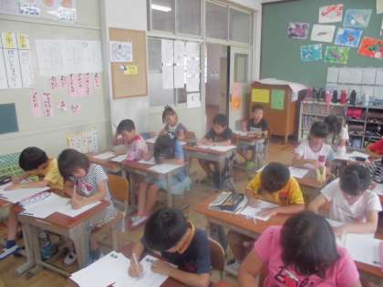 お手本を見ながら、大きさ、バランス、文字の中心を意識して書いていました。