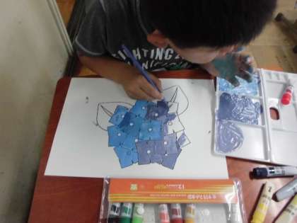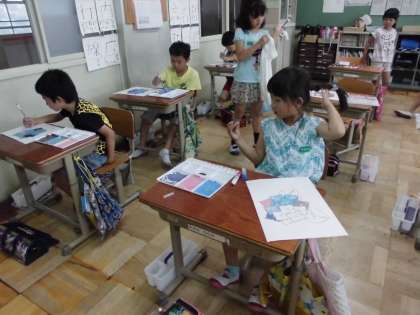 校内に綺麗に咲いているあじさいの花を塗ることにしました。色を混ぜながら「こんな色になった!!」と驚きの声があちらこちらから。水の量の加減が難しかったようですが,きれいなあじさいが出来上がりました。
