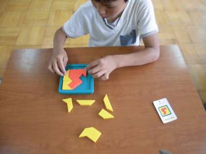 視覚認知トレーニングにパズルを活用しています。はじめは,お手本となるカードを見て,その通りに完成させます。次に,黄色のパーツのみカードを見て,オレンジ色のパーツはカードを隠して完成させます。最終的にはパズルのデザインだけを見て完成させます。目から入力した情報を手先から出力する作業を通して,トレーニングしていきます。たかがパズル,されどパズル,3くみにはなくてはならない教具の一つです。