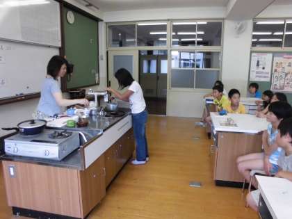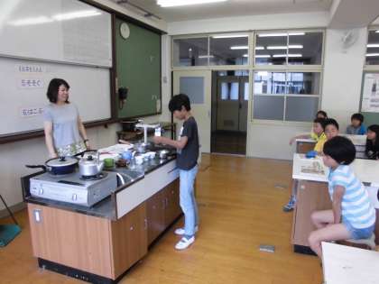 来週の家庭科の学習で,きゅうすでお茶をいれ,みんなで水無月をつくっていただきます。今日はガスコンロの使い方や,お茶の葉の量や水の量などお茶をいれるときのポイントについて教わりました。