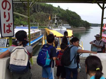 バスは無事に三重県の賢島に到着しました。バスの中には,大きなリュックと係の教員を1人乗せて陸路みさきの家に向かいます。みんなは船に乗り換えて英虞湾をめぐりながらみさきの家に向かいます。