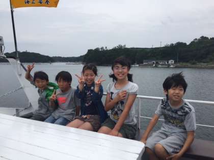 英虞湾めぐりの最中に,交代で船の屋上に登らせてもらいました。風が心地よく,海の香りも伝わってきます。英虞湾のいたる所で海苔の養殖をしている筏をみたり,ご夫婦で働いているらしい,小舟の漁船ともすれ違いました。時々とても小さな島に家が建っていて,プライベートビーチのようでした。