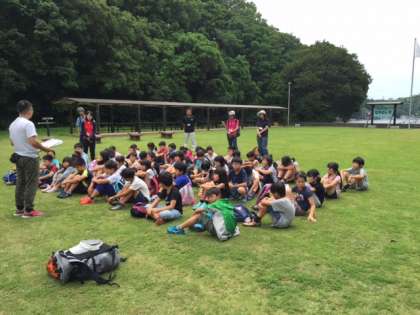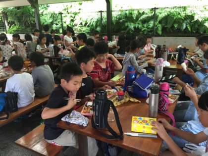 12:30頃,船は「みさきの家」のなかよし港に着きました。そのまま坂を登り,また下って,野外炊事場の屋根の下でお弁当を食べました。朝が早かったので,みんなもりもり食べています。天気は曇っていますが,雨粒は落ちていません。しかし,これからの活動を考えて,入所式を済ませたら,早めに磯観察に行くことにしました。