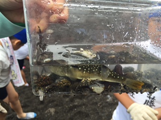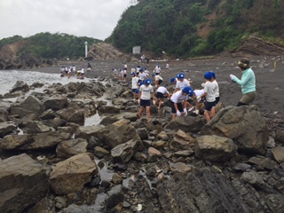 天候が思わしくなかったので,一度はあきらめかけた磯観察ですが,雨雲の切れ間を縫って宮崎浜に出かけました。磯ではヤドカリ,イソギンチャク,魚などいろいろな海の生物を見ることができました。
