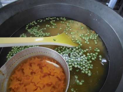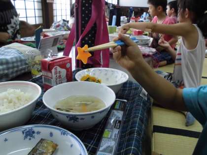 給食では,日本の古くからの習わしを受け継いでほしいと願って,行事とその食事をとりいれています。今日は,たなばたなので,そうめんを天の川に見立てて,「七夕そうめん」を作りました。そうめんの上には,星形のにんじんとオクラが星に見立ててうかんでいます。きょうは,夜空の星も眺めてくださいね。