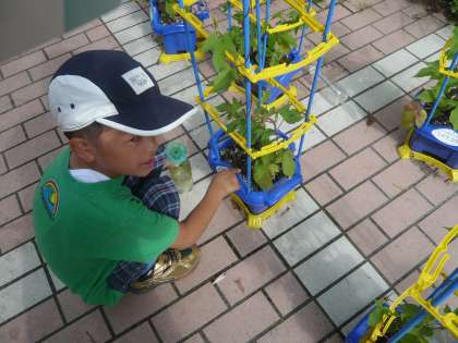 毎日登校すると中庭に置いてある朝顔の植木鉢に水をあげてから1年生は教室にあがります。支柱も立てて,毎日いくつ花が咲いているか観察もしています。