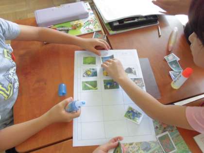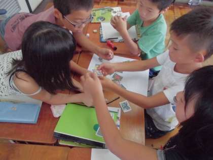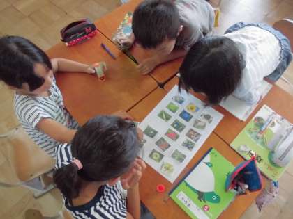 グループで18枚の写真を見ながら話し合い、分類していました。