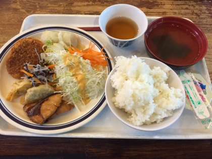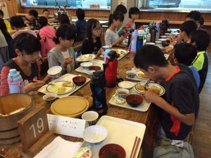 1日目の夕食です。基本はバイキングです。食べ残しがないように自分で考えて取ります。自分の好きなものばかり,たくさん食べるのではありません。サラダもあり,ドレッシングも選べます。ご飯をよそったり,お茶を入れたりは,同じ班,同じテーブルの人の分も協力してします。いただきまーす!!