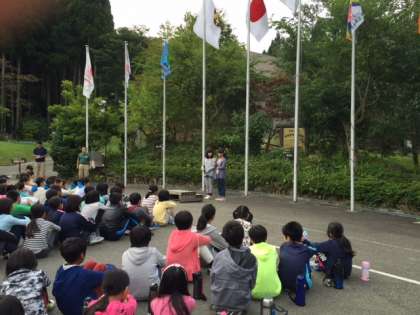 朝のつどいは,昨夜宿泊した5校が合同で行いました。途中にそれぞれの学校の紹介をするところがあるのですが,5校とも原稿を見ないで,しっかり発表することができました。上里校は五番目の登場で,相撲大会のことやガッちゃんのことなど,地域の伝統や生き物を大切にしているところをきちんと紹介できました。
