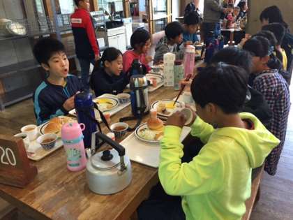 朝のつどいのあとは朝食です。和食か洋食か選ぶことができます。今日の活動のためにみんなしっかり食べていました。