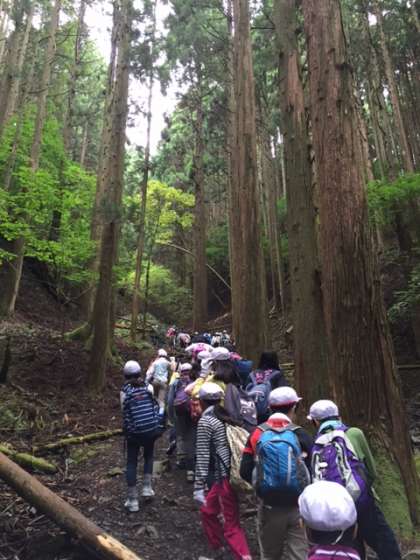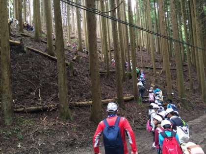 三日目のテーマは挑戦です。およそ半日かけて,天狗杉登山に挑みます。長袖,長ズボン,首タオルと用意は万全です。出発していきなり急な坂があらわれました。みんなで声をかけあいながら進みました。