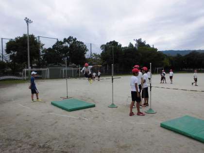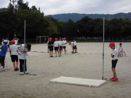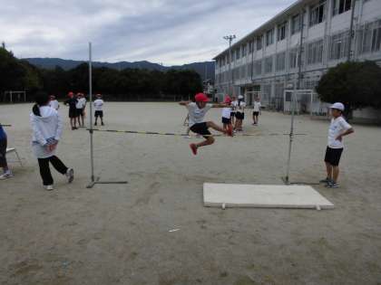 体育の学習では,「走り高跳び」に入っています。「はさみとび」のような跳び方で自分の身長と50メートル走のタイムから割り出した「ノモグラム(自分の目安の高さ)」を目指してとぶようにがんばっていきます。活動の前に「正しい跳び方」の映像を見てイメージを広げ,そのあと実際に跳んでみました。前足と踏切足をバーの上で入れ替えるようなイメージをもって跳ぶことでふんわりと高く跳べるようになってきました。