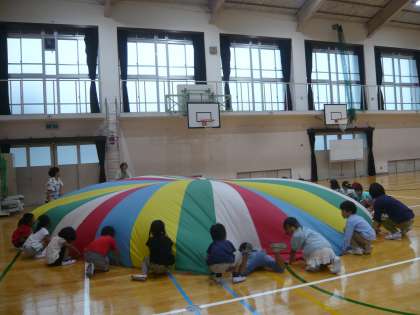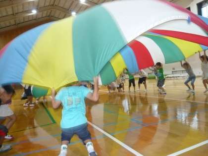 「ゆめをかなえて,ドラえもん」の曲に合わせて,大きなバルーンをみんなで協力してふくらましたり,くるくる回ったりしました。