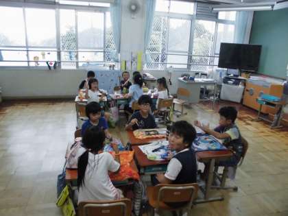雨で延期は残念だけれど,教室でお弁当はうれしい〜と,お弁当のおかずを教え合っている子どもたちです。