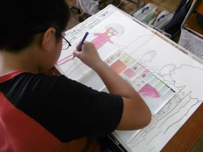 子ども達は,静まりかえった教室の中で,丁寧に線描きをし,工夫して色を塗っています。