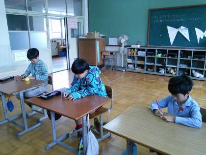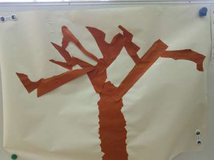 3くみでは,1日のふりかえりを,各自言葉にしてはっぱに書いて,『すてきの木』に貼る取り組みをしています。前期は,緑のはっぱがたくさんついた木になりました。
