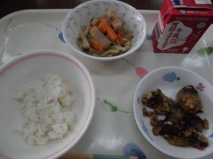 少しずつ空気が冷たくなり,給食室でもピーマンやなすといった夏野菜から,だいこんやはくさいの冬野菜を使うようになりました。今日は,だいこんやごぼうを使って,石川県の羽咋市の郷土料理の一つの「あいまぜ」を作りました。あいまぜは石川県で必ずお正月に食べられる料理だそうです。野菜はいろいろなものがつかわれるそうですが,給食ではだいこん,にんじん,ごぼう,こんにゃく,ちくわ,油あげをだし汁にさとう,しょうゆ,みりんを加えて煮ます。