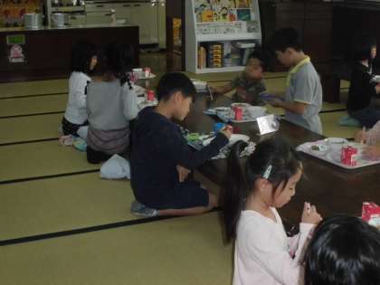 いろりの間はクーラーがないので,暑い時期は使っていませんでしたが,10月に入り過ごしやすくなってからいろりの間での給食を再開しました。今日は2年1組のみんなが楽しくいろりの間で給食をいただきました。