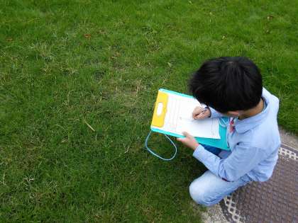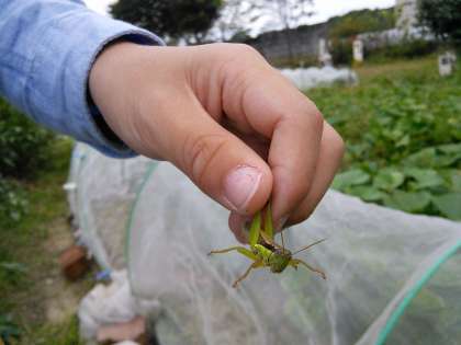 理科の時間,『動物のすみかを調べよう』で,動物をさがしに行きました。すぐに,畑近くの草はらで,カマキリやバッタを見つけました。「カマキリやバッタは,くさのところにいる。」,「食べ物があるねん。」,「くさの中に隠れてる。」など,いろいろ発見することができました。